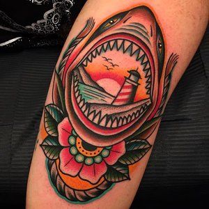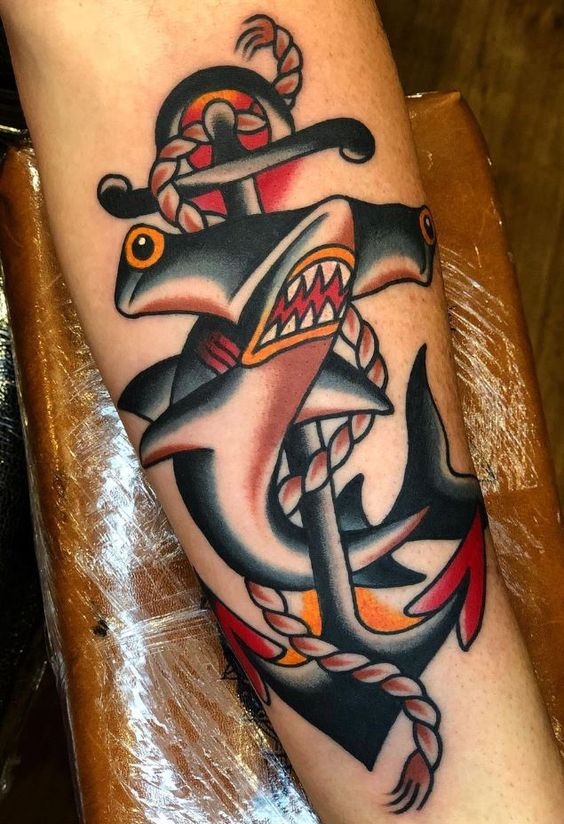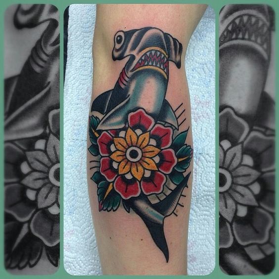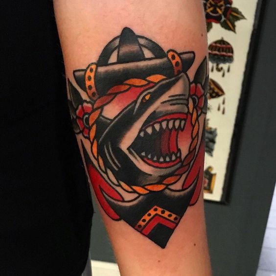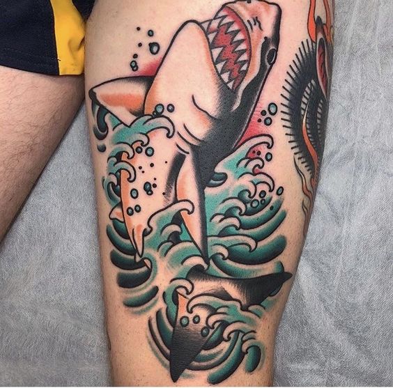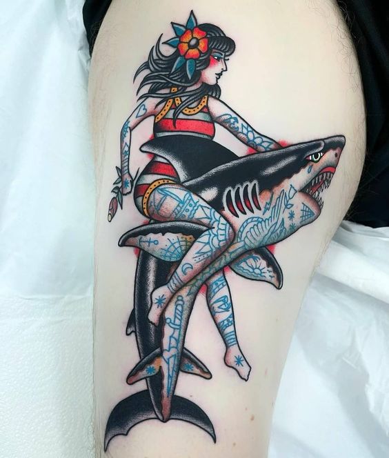 The American traditional shark tattoo, with its bold colors and classic style, is iconic. It often symbolizes danger, freedom, and the unknown depths of the sea. This tattoo is perfect for those who embrace the adventurous spirit of the ocean.