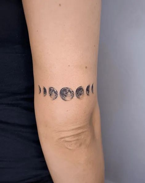 Additionally, these tattoos create a striking visual around the wrist, mimicking celestial motion. They can adorn the back, too, each phase following the spine’s arch. Plus, the design is meaningful and expressive, making a quiet yet profound statement. Hence, it embodies personal transformation and the beauty of the cosmos in one.