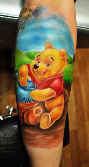 The tattoo often features Winnie the Pooh in a joyful pose. He’s usually seen hugging his honey pot, a symbol of happiness and contentment. The design can be intricate or simple, depending on your taste. Moreover, the tattoo can be placed anywhere on the body. Popular spots include the forearm, calf, and even the back.