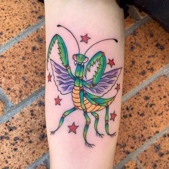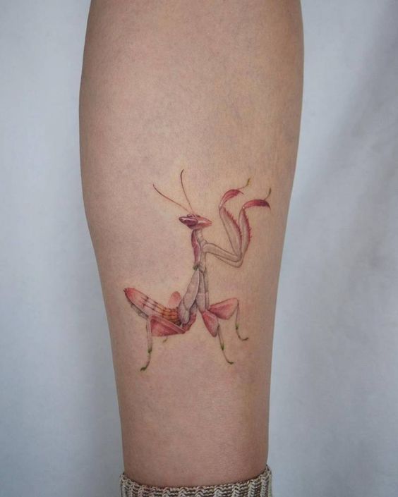 One design features a vivid, hyper-realistic praying mantis. The attention to detail in this tattoo brings the insect to life, right on your skin. Another design takes a minimalist approach. Here, simple lines and elegant curves highlight the mantis’s form, offering a subtle yet impactful statement. For those who love color, a vibrant, watercolor praying mantis tattoo bursts with life and energy, blending vivid hues in a dream-like composition.