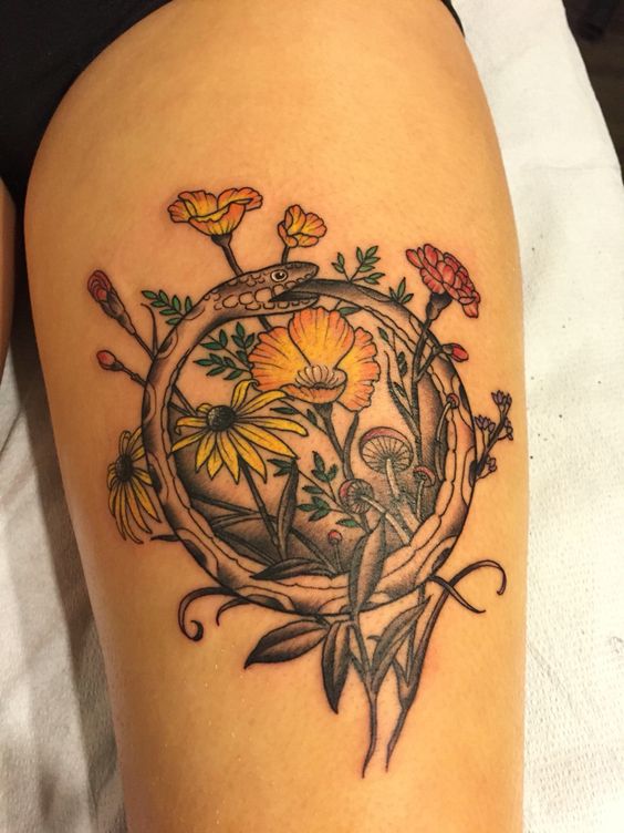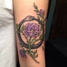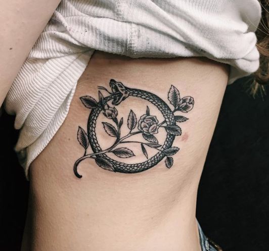 A delicate floral ouroboros tattoo combines nature’s beauty with symbolic infinity. This design incorporates soft floral patterns within the ouroboros, creating a gentle, yet meaningful tattoo. Additionally, it perfectly suits those who adore nature-inspired art.