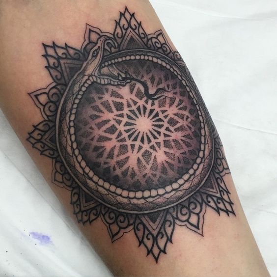 A lace-patterned ouroboros tattoo combines tradition with femininity. The intricate lace details bring a vintage charm to the design. Additionally, this style is perfect for those who appreciate delicate artistry.