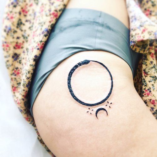 Consider a moon phase ouroboros tattoo for a celestial touch. This design integrates the phases of the moon within the ouroboros, symbolizing eternity and the feminine connection to the cosmos. Moreover, it’s a mystical and captivating choice.
