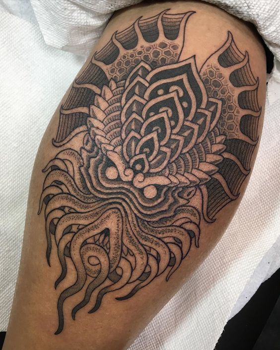 A popular design, for instance, is the detailed portrayal of Cthulhu’s visage. With tentacles swirling and eyes piercing, these tattoos capture the entity’s ominous presence. Alternatively, some artists choose a more abstract approach, using shapes and colors to suggest Cthulhu’s formless terror. These tattoos are perfect for those who prefer a hint of the unknown.