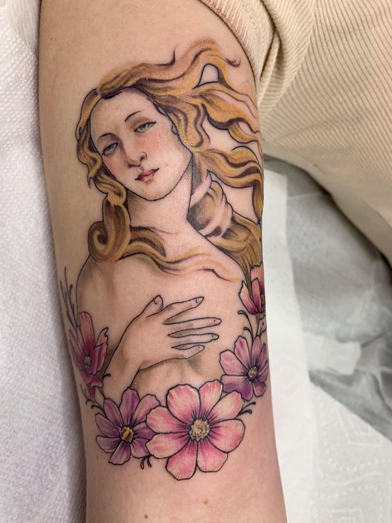 A tattoo of Aphrodite in a garden of Eden-like setting reflects nature’s beauty and fertility. It’s a serene and picturesque depiction of the goddess. Lastly, a colorful depiction of Aphrodite brings her to life with vibrant hues, celebrating her in all her glory.