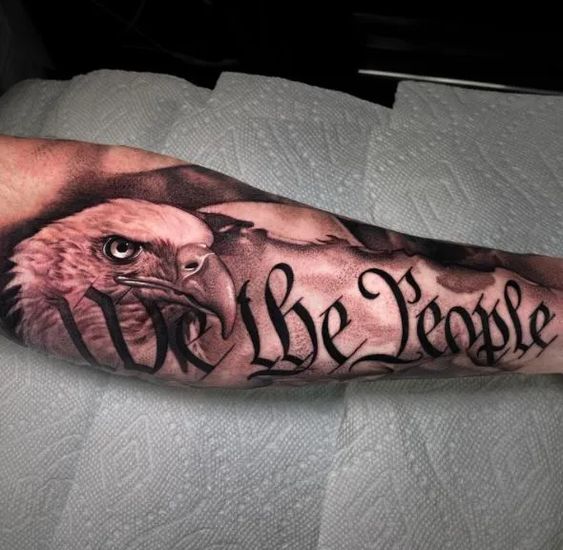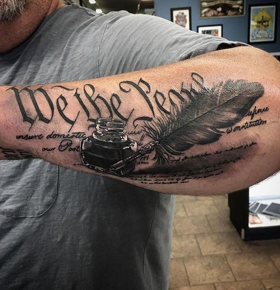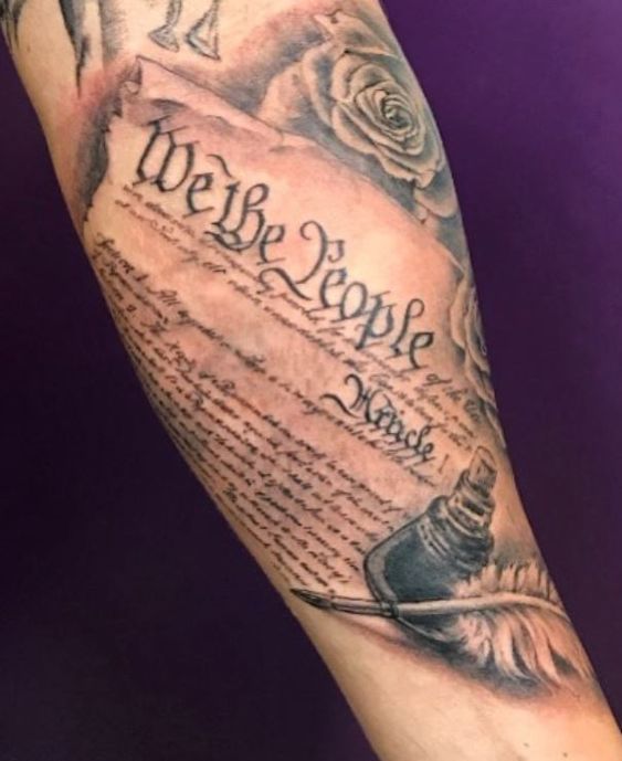 Additionally, there’s a piece where ‘We the People’ sits atop a clock, marking time with history’s pen. Finally, a tenth tattoo integrates a quill and ink, the tools that wrote America’s destiny. Each We the People tattoos capture the spirit of the Constitution, embodying ideals that define a nation.