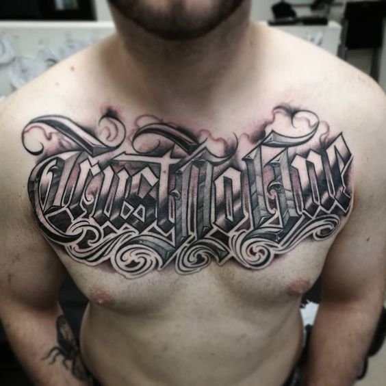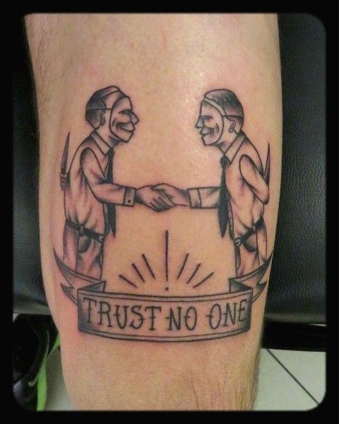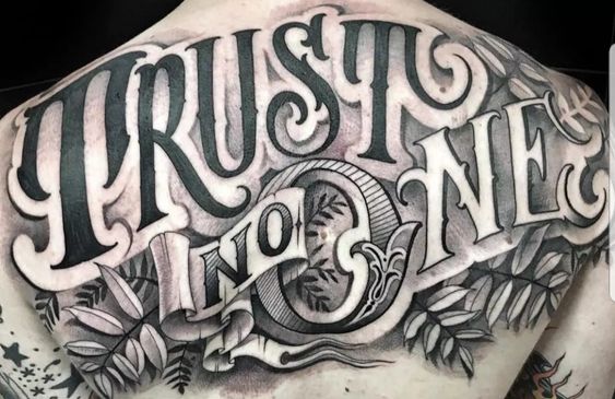 Moreover, these tattoos can adopt a more urban look with graffiti-style lettering. Alternatively, they are sometimes accompanied by a chessboard, illustrating life’s strategic and deceptive nature. Lastly, a simple, stark ‘Trust no One’ on the forearm serves as a bold reminder of the wearer’s life lessons.