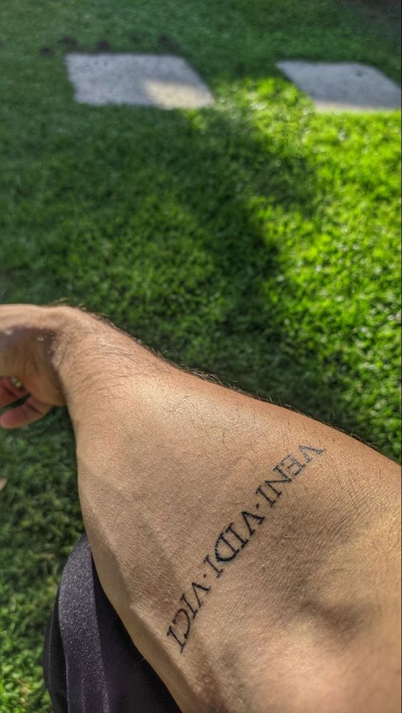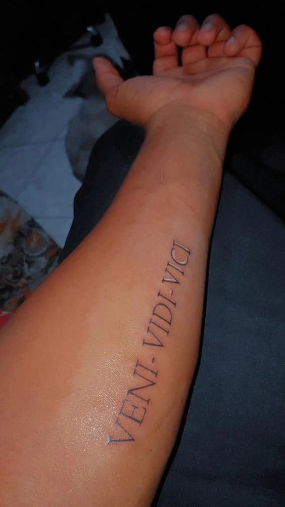 In conclusion, tattooing Veni vidi vici on your forearm is a powerful way to symbolize your personal victories. It’s not just a tattoo; it’s a testament to your journey and resilience. Visible, versatile, and deeply meaningful, a forearm Veni vidi vici tattoo is a choice you’re likely to cherish for a lifetime. It serves as an ever-present reminder of your strength and ability to conquer challenges. This tattoo is not only a piece of art but also a badge of honor, reflecting your enduring spirit and achievements.