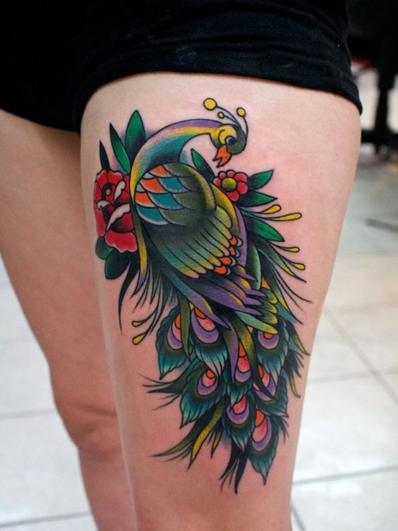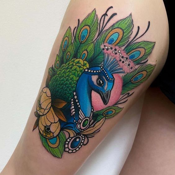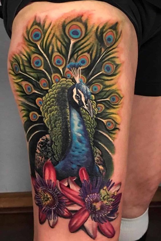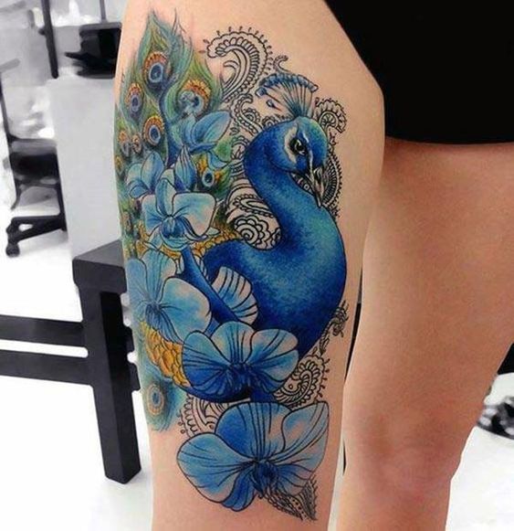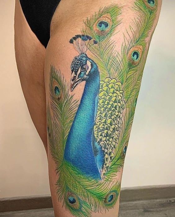Peacock tattoos on the thigh are a magnificent trend in the world of body art. They offer a perfect canvas for showcasing the peacock’s natural splendor. Thigh tattoos provide ample space, allowing artists to capture every intricate detail. These designs are not just tattoos; they are wearable art, symbolizing beauty and grace.