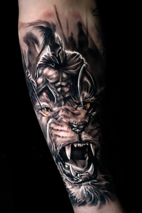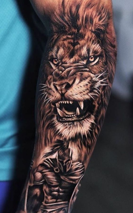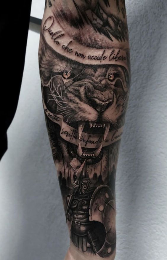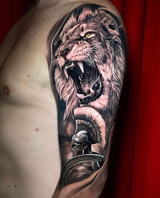 First off, imagine a roaring lion donning a gladiator helmet. Unquestionably, this design is a top choice that effortlessly turns heads and captivates hearts. Furthermore, you can add a shield or sword to boost its appeal. Alternatively, envision a lion valiantly fighting in a Colosseum. This vivid scene brings your skin to life, turning your body into a living canvas with a thrilling tale to tell.
