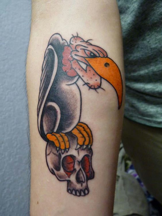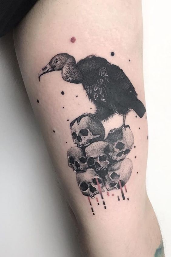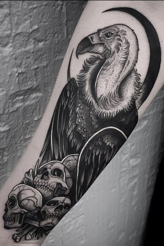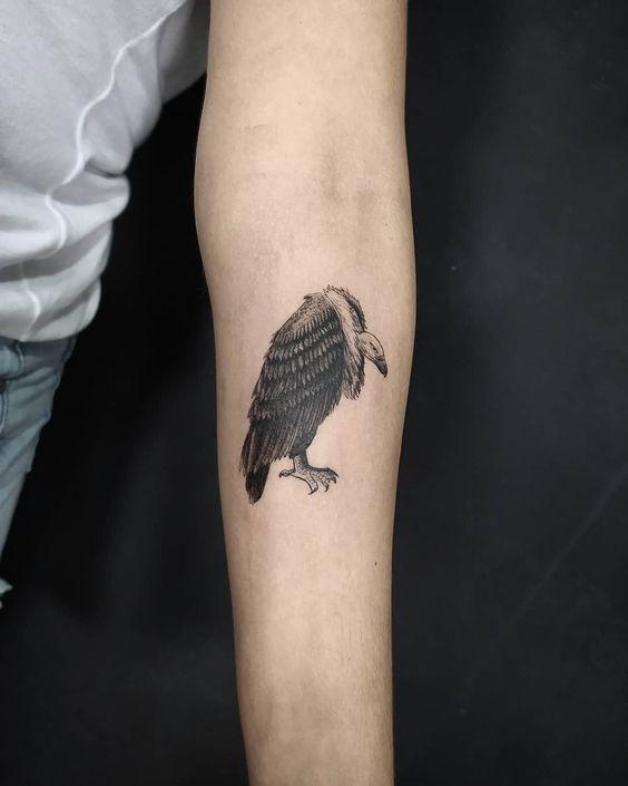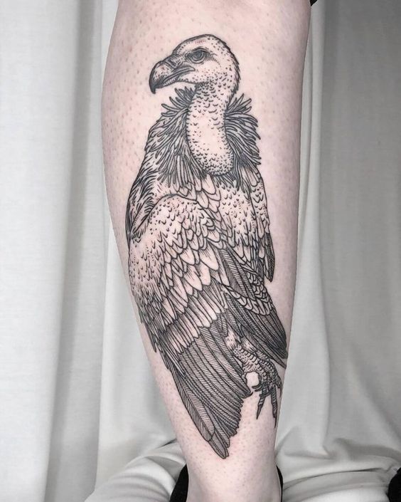 A vulture feather tattoo, delicate yet significant, symbolizes the bird’s essence. A traditional style vulture tattoo harks back to classic tattoo artistry. A geometric vulture design plays with shapes and patterns, offering a contemporary twist. A vulture skull tattoo merges life and death themes, reflecting deep contemplation.