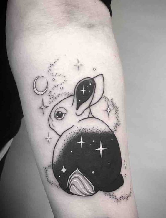 Moreover, these tattoos capture the playful spirit of the rabbit with the moon’s serenity. They can be playful or profound, often sparking curiosity and awe. Plus, their allure crosses cultures, enchanting people all over the globe. Equally, they’re versatile, fitting into tiny spaces or sprawling as a centerpiece.