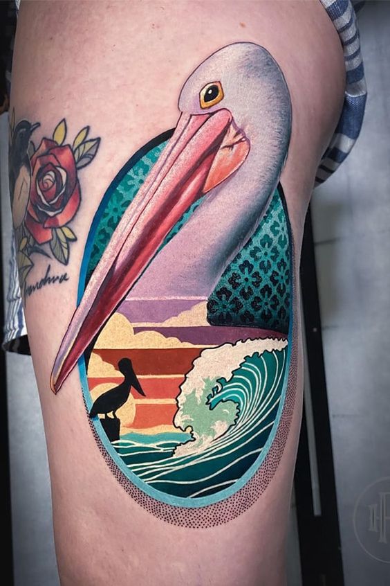 For a touch of color, consider a watercolor pelican tattoo. These tattoos use vibrant hues, resembling a painting on your skin. Particularly, they’re perfect for those who love colorful, eye-catching designs. Additionally, a minimalist pelican tattoo is an elegant option. Simple lines and minimal detail make these tattoos subtly beautiful, and they’re ideal for individuals who prefer understated elegance.
