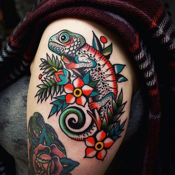 Chameleon tattoos are not just a choice, but a statement for anyone seeking a unique design. Representing adaptability and transformation, these tattoos symbolize life’s dynamic nature. Accordingly, they cater to a wide range of styles and preferences, offering something special for everyone.