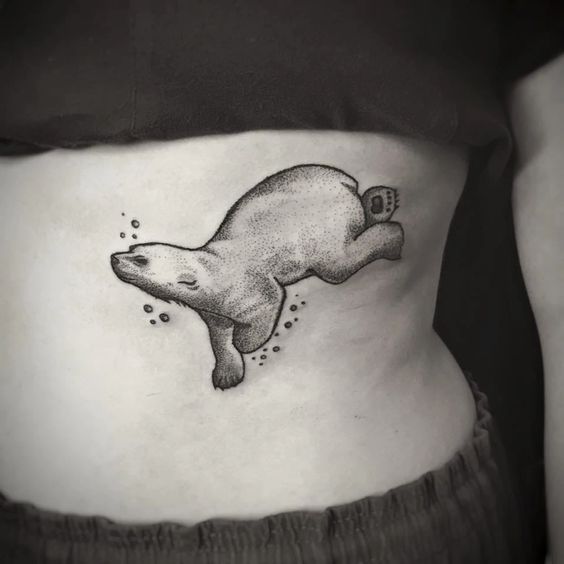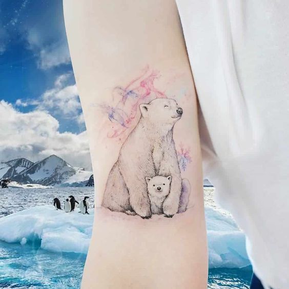 Firstly, one design features a polar bear in a snowy landscape, capturing the animal’s natural habitat. Additionally, another design presents a polar bear with geometric patterns, skillfully blending modern art with wildlife. Moreover, an intricate design shows a bear with a cub, symbolizing maternal love and protection. Also, one minimalist tattoo highlights the bear’s silhouette, emphasizing its elegant form.