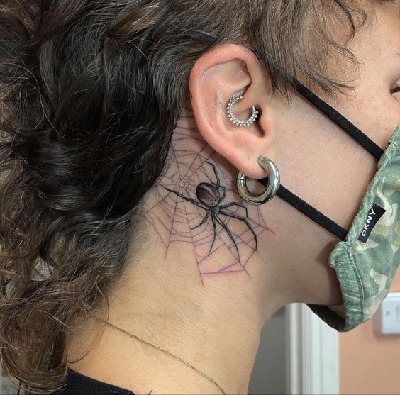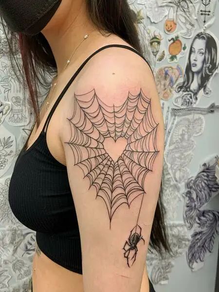 Spider net tattoos look stunning on any part of the body. They can elegantly drape over shoulders, wrap around arms, or accentuate the back. Furthermore, they’re not just for the bold; even minimalistic designs hold powerful symbolism. They can also be a focal point or part of a larger, thematic piece.