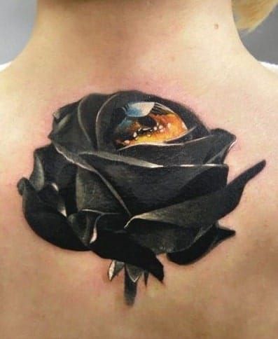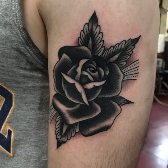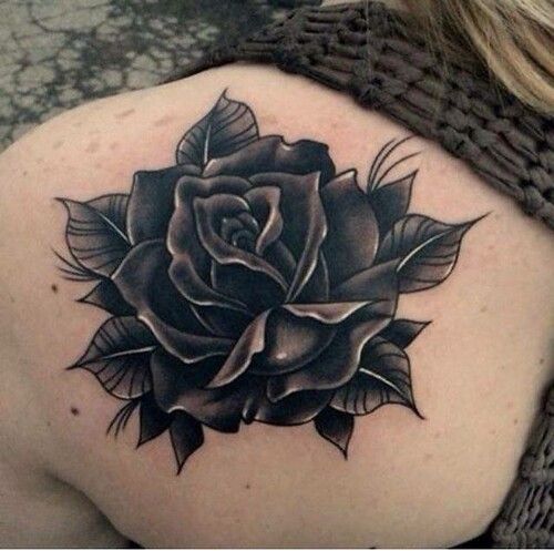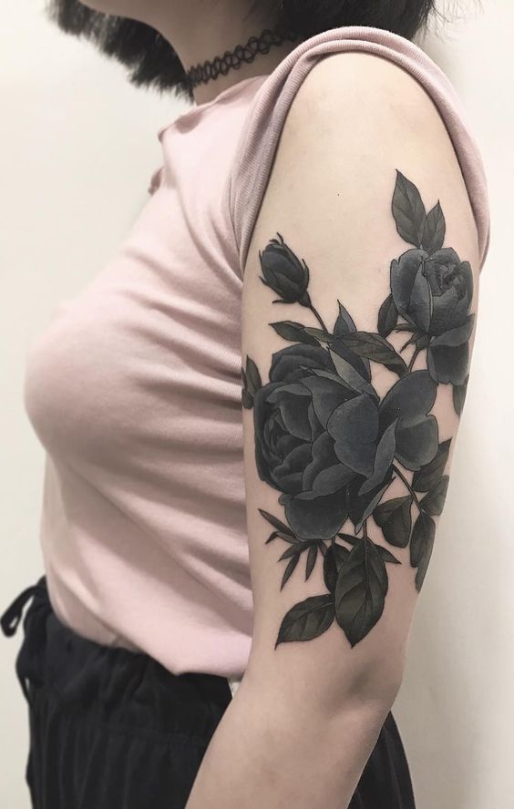 Envision a large, detailed black rose tattoo on the shoulder. It’s a bold statement piece, showcasing artistry and elegance. Additionally, it’s perfect for those who prefer eye-catching, larger tattoos.