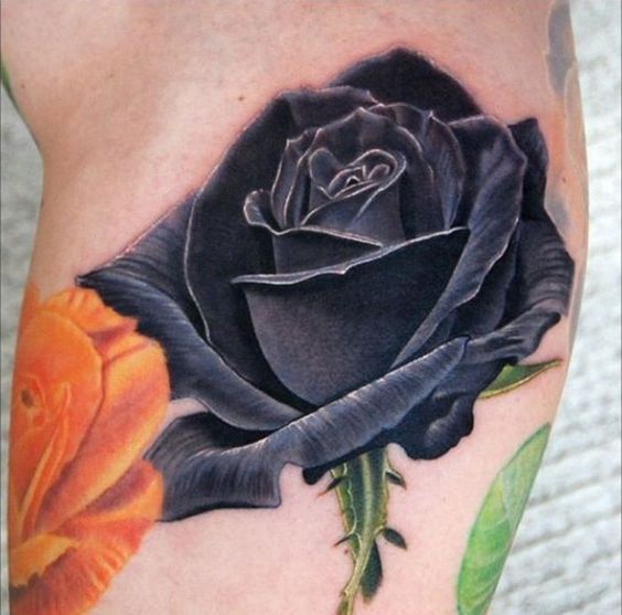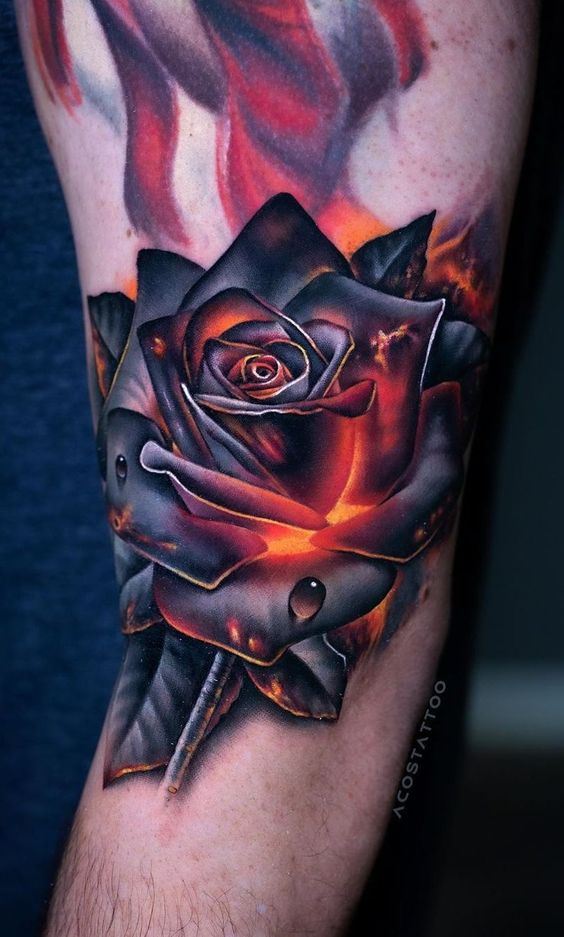 Visualize a black rose tattoo with a splash of color. A single color accent can highlight its beauty. Also, it adds a unique twist to the classic black rose design.