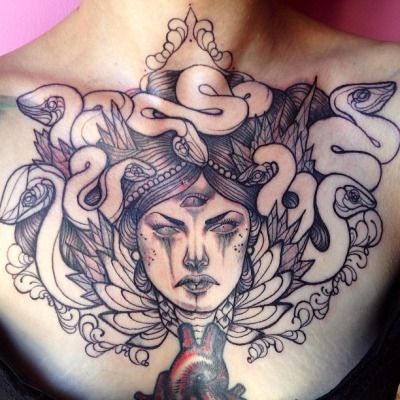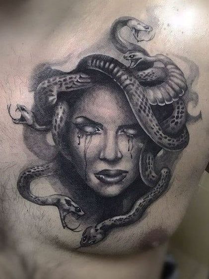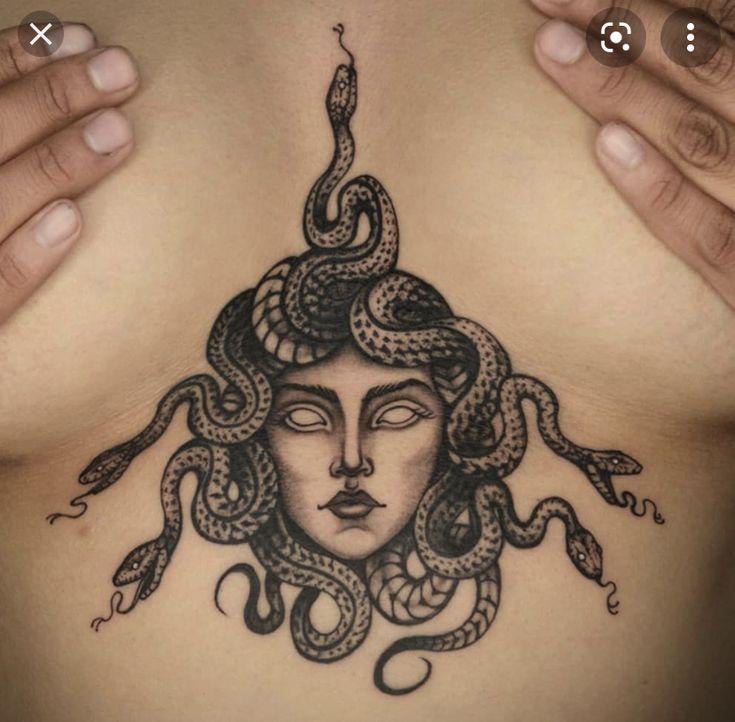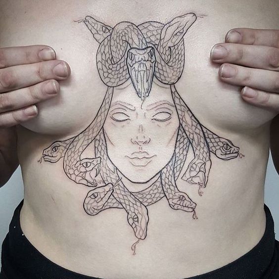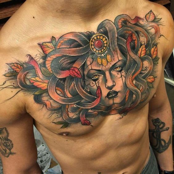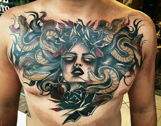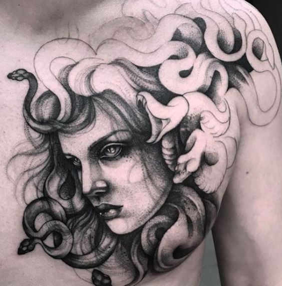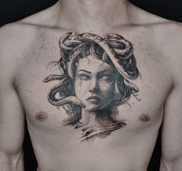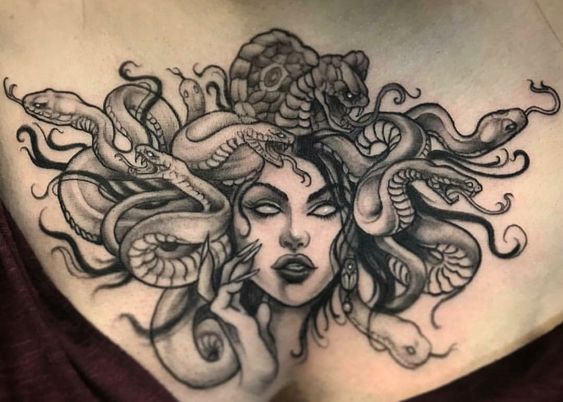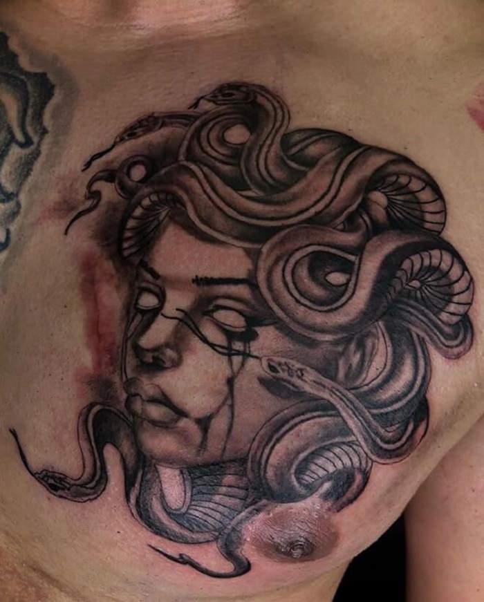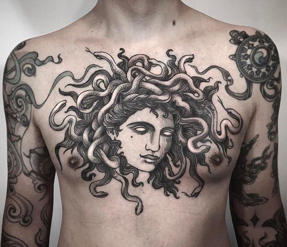 Secondly, let’s delve into symbolism. Medusa represents various themes, from transformation and rebirth to feminine power. Therefore, having a Medusa tattoo on your chest can serve as a daily reminder of these potent themes.