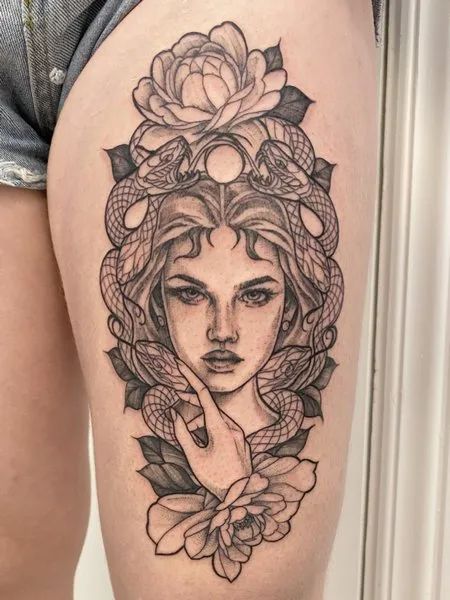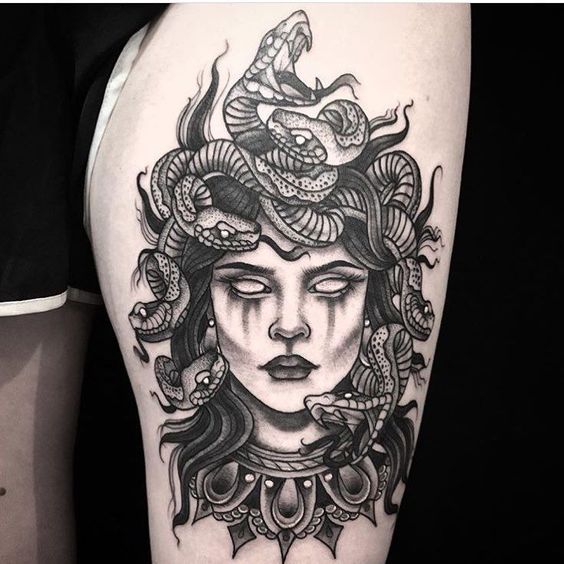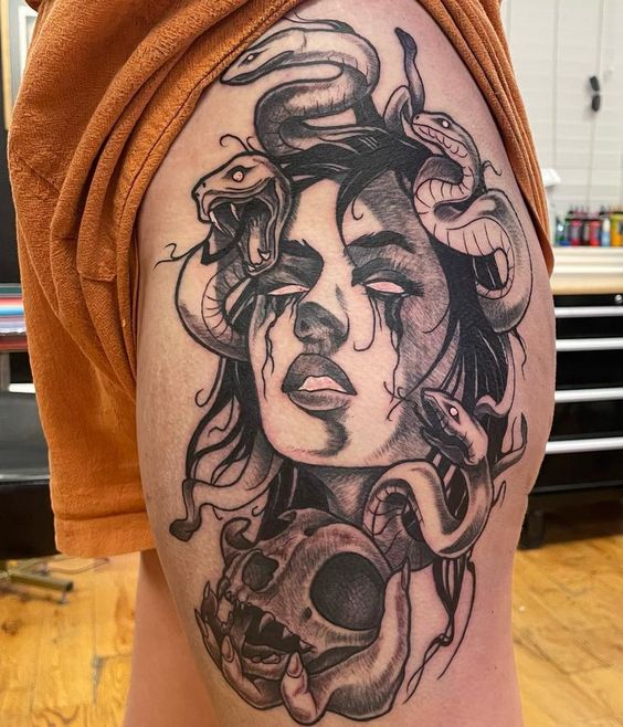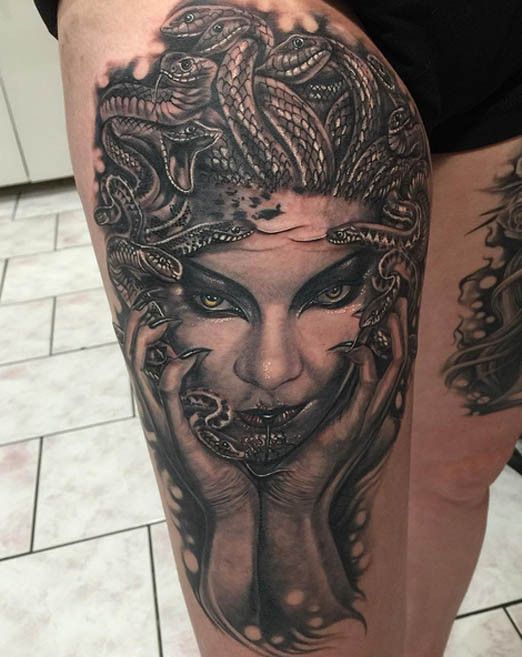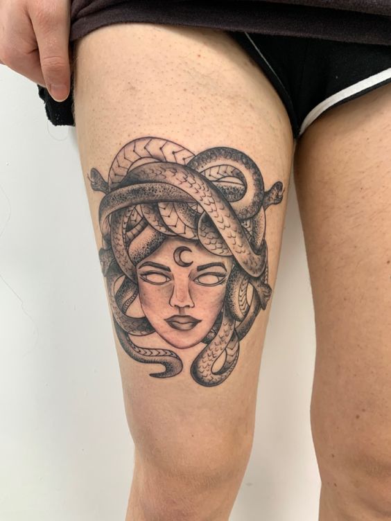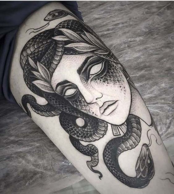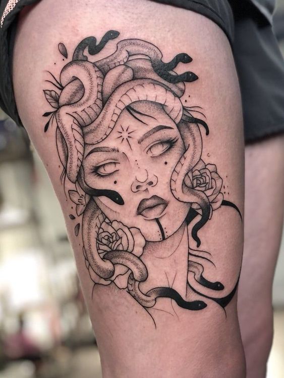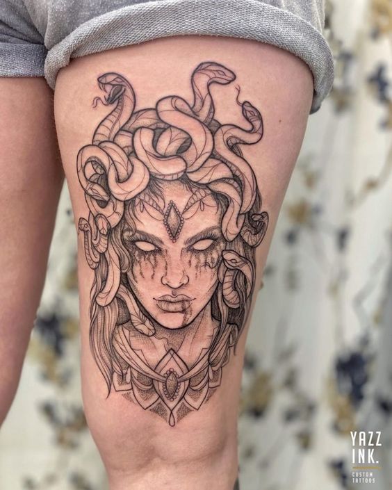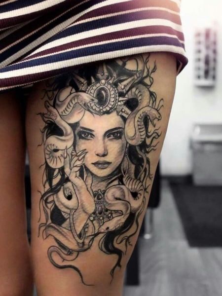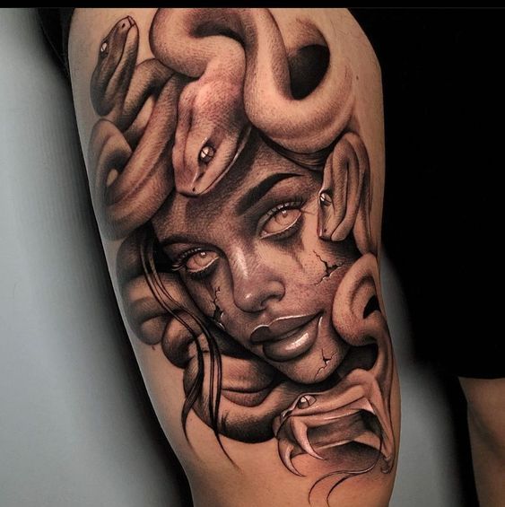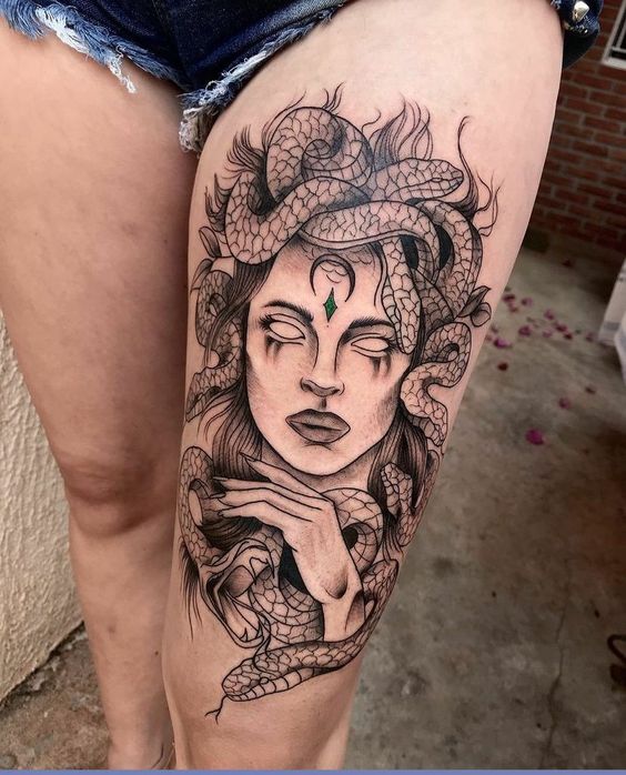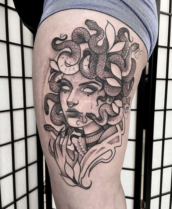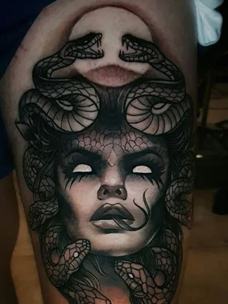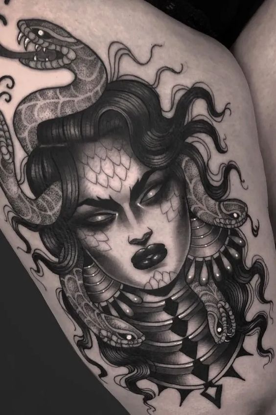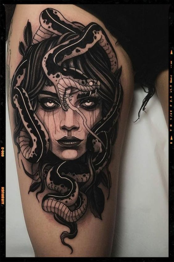 In summary, black and white Medusa tattoos on the thigh are a bold choice. They’re enduring, personal, and deeply symbolic. They’re not just tattoos; they’re stories etched in skin, conversations waiting to happen. Choose wisely, and your Medusa will not just adorn, but empower you.