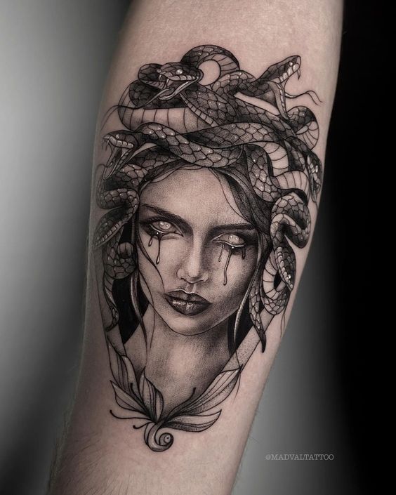 Let’s dive in. Black and white tattoos offer a dramatic contrast. Additionally, they highlight the intricate details of Medusa’s serpentine hair. Moreover, the lack of color focuses the eye on the design’s depth. Consequently, the tattoos appear more lifelike, almost ready to slither off the skin.