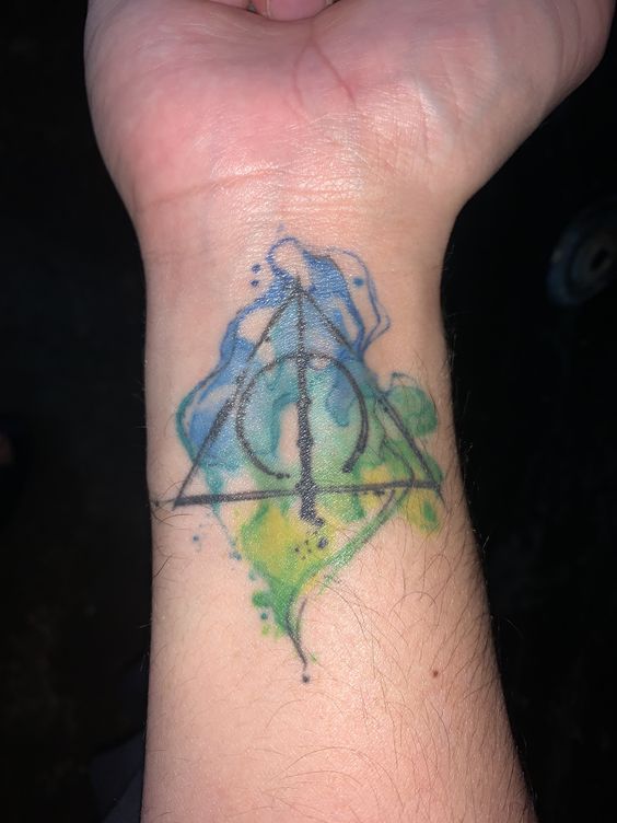 Watercolor Deathly Hallows tattoos bring a magical touch to body art, with a splash of vibrant colors. These tattoos blend the iconic symbol with the whimsy of watercolors. Imagine the Deathly Hallows, not just in black ink, but bursting with color. This art form turns a familiar symbol into a unique expression of fantasy and creativity.