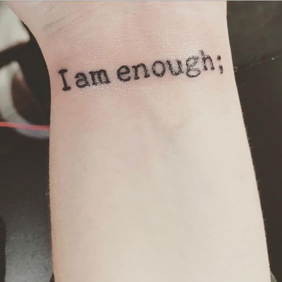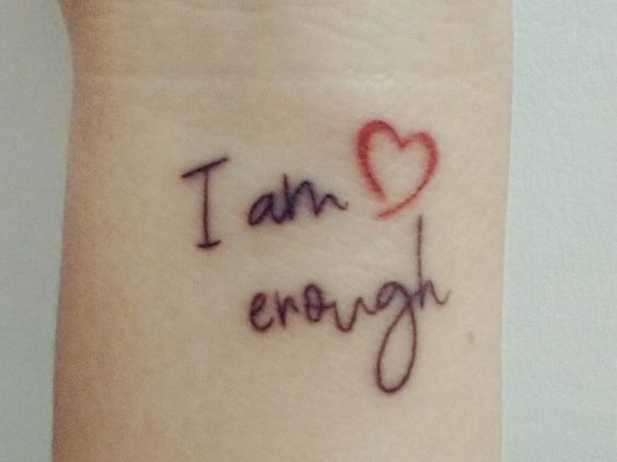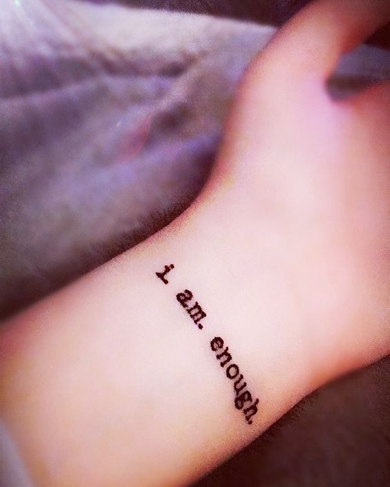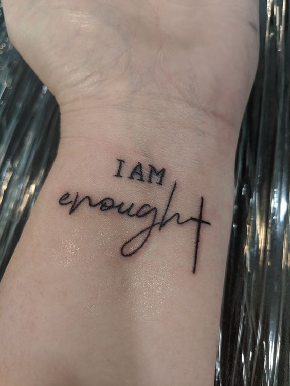 Small yet impactful, wrist ‘I am enough’ tattoos fit discreetly into any setting. Despite their size, they’re visible enough to catch your eye throughout your day. As a result, they serve as a constant, uplifting reminder. You are enough just as you are, no more and no less. In your imperfection, you find your true self.