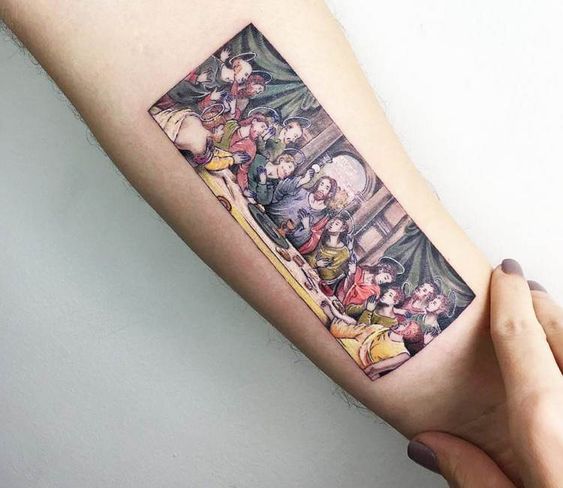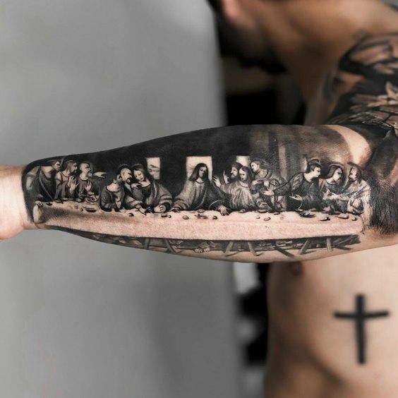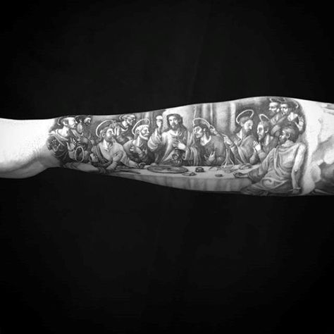 With these tattoos, you join a tradition spanning centuries, connecting with people who found inspiration in the Last Supper. Appreciate the beauty of this artwork and its enduring significance. Embrace faith and art with Last Supper forearm tattoos, letting your skin tell a timeless story.