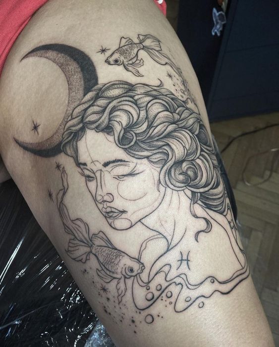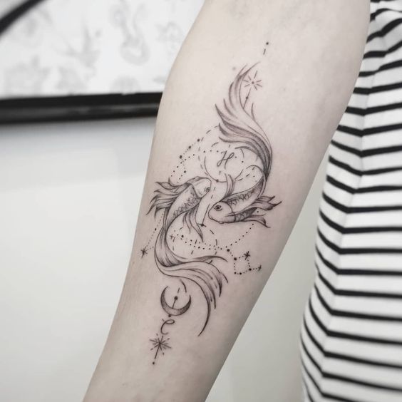 Symbolic elements like the moon, which represents intuition and the subconscious, are also incorporated into Pisces tattoos. A moon nestled within the Pisces fish or constellation adds a layer of depth and mystery to the design.