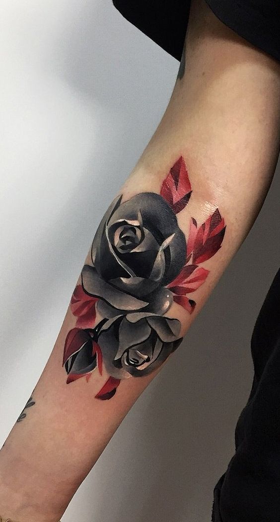 Visualize a watercolor rose tattoo. Here, colors blend like paint, vibrant and eye-catching. Furthermore, this style is ideal for the artistically inclined, offering a splash of color on your arm.