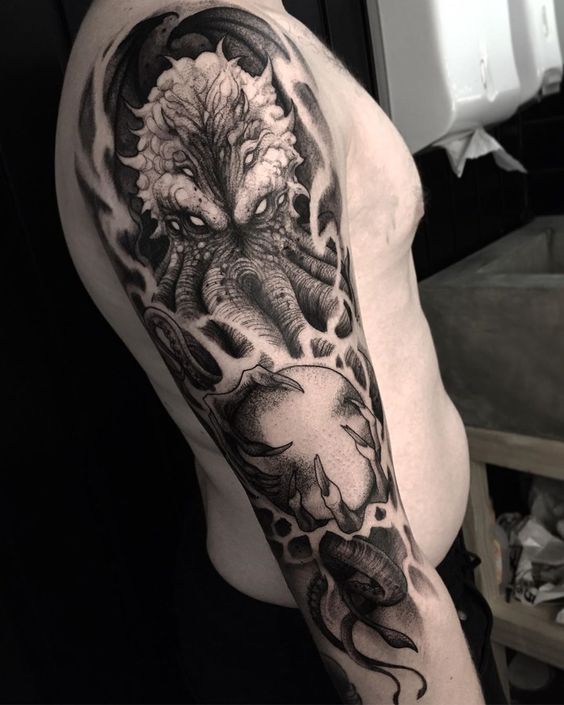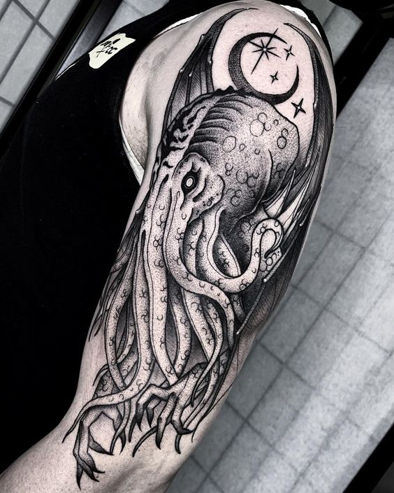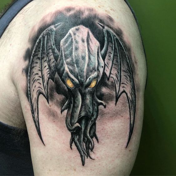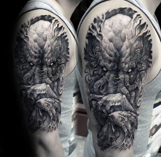 In conclusion, shoulder Cthulhu tattoos are not just about inking skin. Importantly, they are about expressing a fascination with the unknown, the powerful, and the mysterious. With a variety of styles, from the traditional to the abstract, these tattoos offer a unique way to showcase personal intrigue and admiration for the mythos of Cthulhu. They are indeed perfect for those who wish to carry a piece of the dark and mysterious with them.