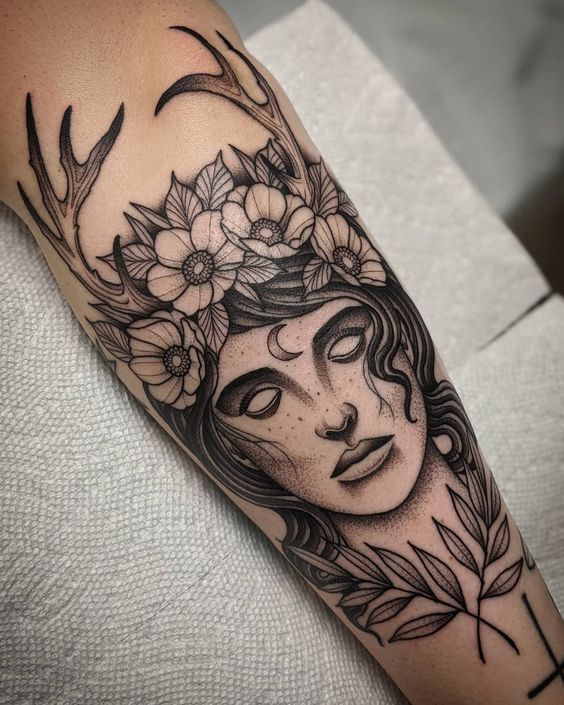 While black and gray offer a timeless look, adding color can make your Artemis tattoo pop. Greens and browns can add depth to the wilderness elements. Moreover, subtle shades can bring out the details in the goddess’s attire.