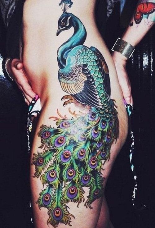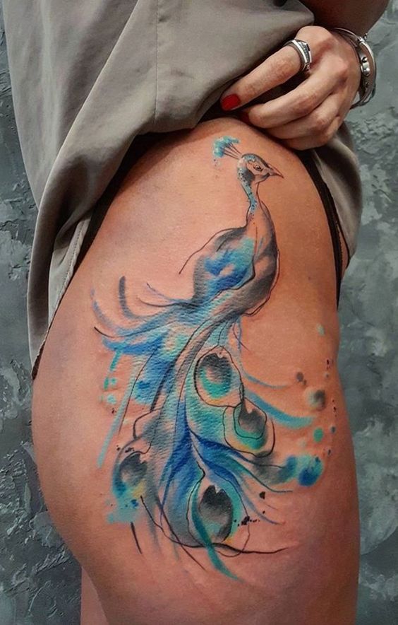 Watercolor peacock tattoos are gaining popularity. They blend vibrant colors in a dreamlike manner, mimicking the bird’s natural splendor. These designs suit those who love a splash of color and artistic expression. Conversely, black and grey designs offer a classic, timeless appeal.