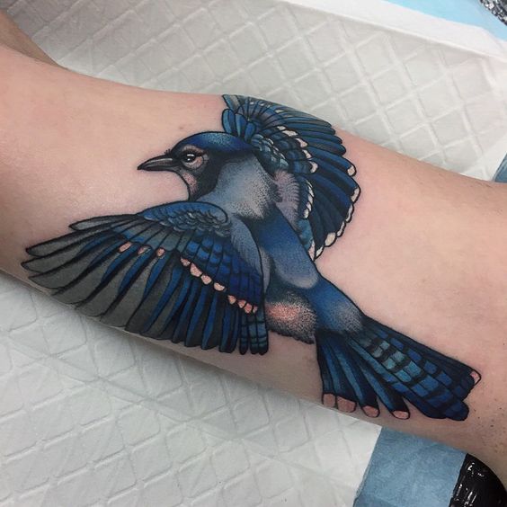 Each of these tattoos showcases the blue jay in different artistic lights. Some feature the bird in flight, symbolizing freedom and aspiration. Others depict the blue jay perched, reflecting introspection and calm. The variety in these designs speaks to diverse personal meanings.