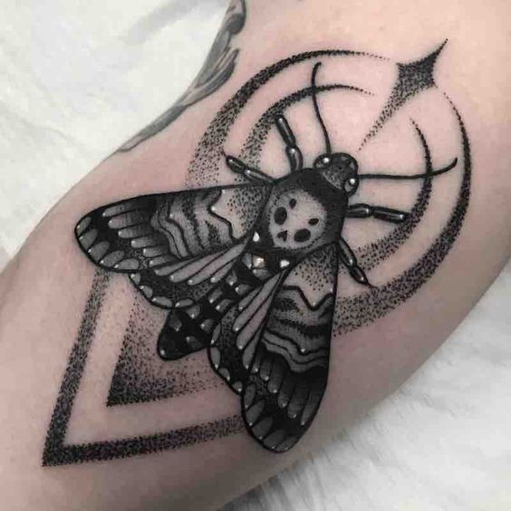 Secondly, think of triangles and diamonds adorning the moth’s wings, creating a 3D effect. Additionally, this design can symbolize growth and progress amidst life’s fleeting nature. Furthermore, adding a spectrum of colors could give the tattoo a vibrant, stained-glass look. Consequently, this makes the moth not just a creature of the night, but of light as well.