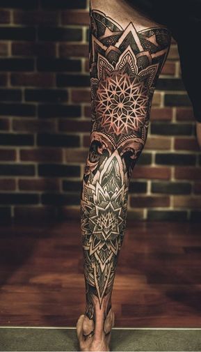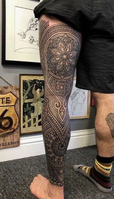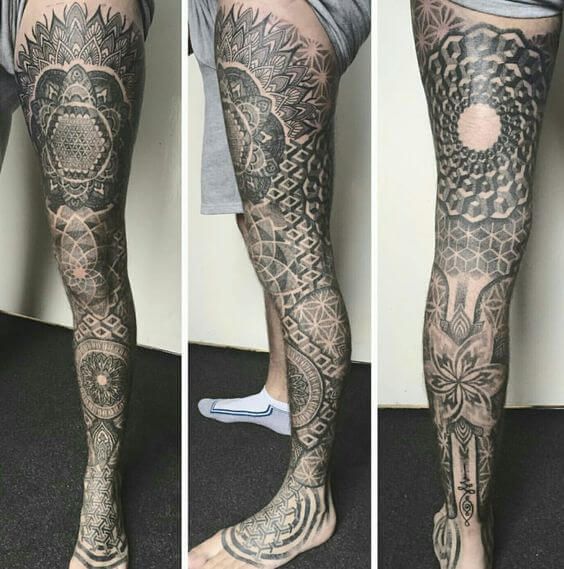 Full leg mandala tattoos for men are a bold choice. They’re not just a design; they’re a statement. This art form covers the entire leg, from thigh to ankle. Hence, it’s a commitment to both time and pain. Yet, the end result is an awe-inspiring piece that captures attention.