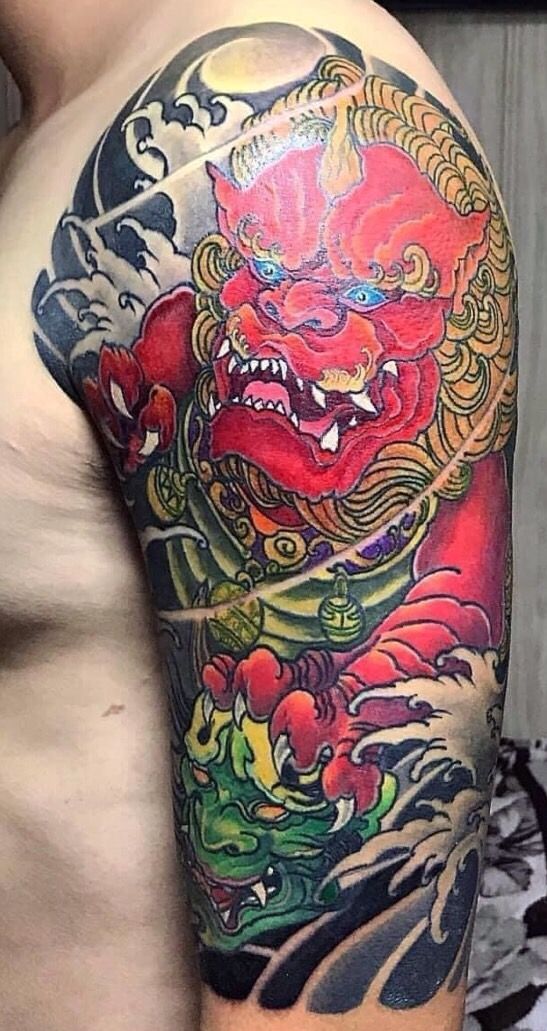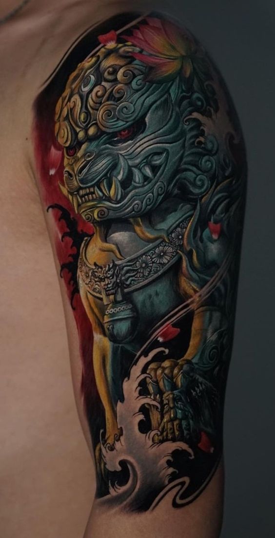 As for color choices, you’re not limited. While traditional black and gray are timeless, adding a splash of color can make your tattoo pop. Reds and blues are popular choices, adding an extra layer of depth to your foo dog half sleeve tattoo. Additionally, even a touch of gold can elevate the design, making it truly unique.