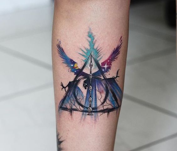 You can also see some of watercolor Deathly Hallows tattoos here.