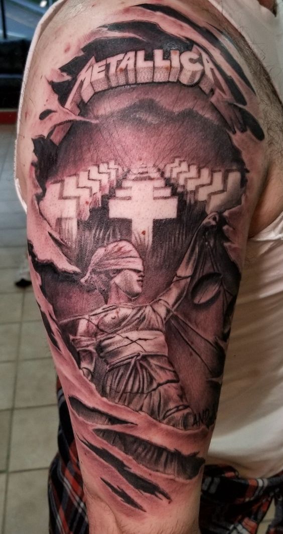 Consider the ‘Electric Chair’ from ‘Ride the Lightning’ electrifying your bicep. It’s a striking statement of power and rebellion. Visualize the ‘Scary Guy’ logo looming on your shoulder blade. It’s a bold emblem of your inner strength and defiance. Think about ‘And Justice for All’ scales balancing on your forearm. They symbolize your quest for truth and integrity.