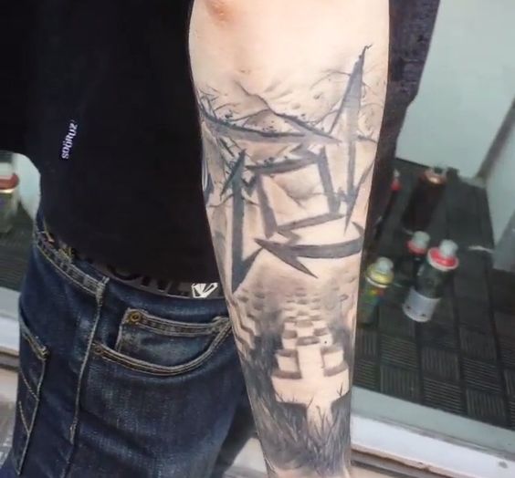 Even the lyrics from “Fade to Black” can cascade down your ribcage. They serve as a constant whisper of your deeper thoughts and feelings. The ‘Hardwired’ glitch could envelop your wrist, a modern nod to your favorite band. Additionally, consider combining the iconic ‘M’ with musical instruments. This fuses Metallica’s essence with the tools of their trade.
