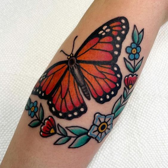 The traditional tattoo style is known for its bold lines and vibrant colors. It adds a classic touch to the Monarch butterfly design. Moreover, this style has been around for decades, proving its lasting appeal. It also allows for a more vivid and long-lasting tattoo, making it a wise choice for many.