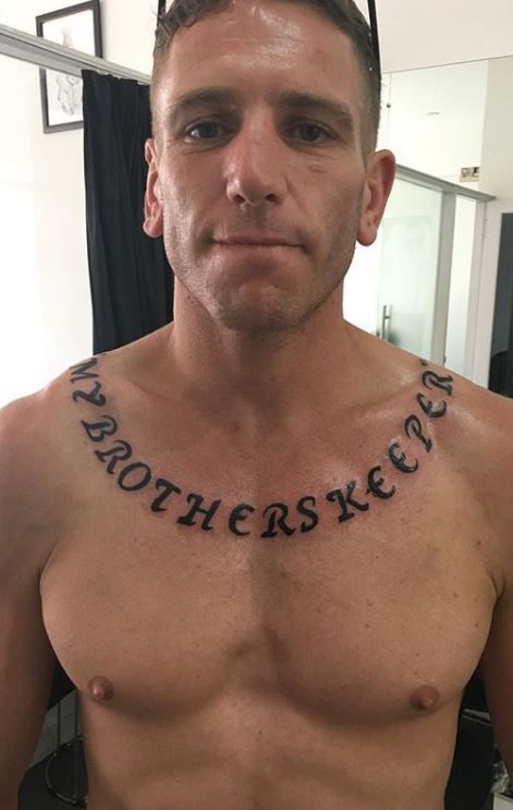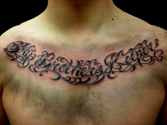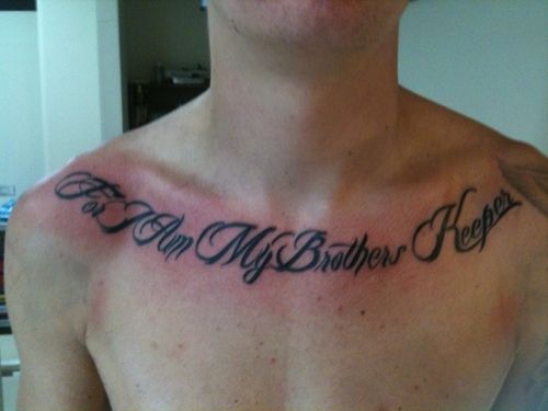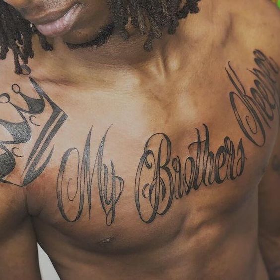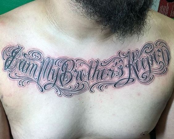 A “My Brother’s Keeper” chest tattoo makes a bold statement of unbreakable bonds. Right over the heart, these words signify deep connections. Every letter etched into the skin tells a story of fidelity and care. Indeed, such tattoos are not mere decorations but oaths made visible.