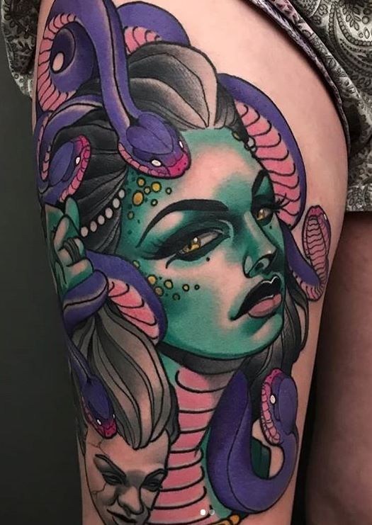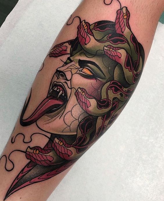 Firstly, let’s talk about the design. Neo traditional Medusa tattoos often feature bold lines and vibrant colors. Moreover, this style allows for creative freedom, making the tattoo visually captivating and unique.