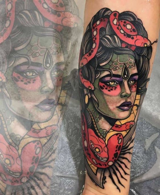 Sixthly, let’s talk about color. Neo traditional Medusa tattoos often use a rich palette of greens, reds, and blues. However, you can also opt for a more subdued color scheme if that suits your style better.