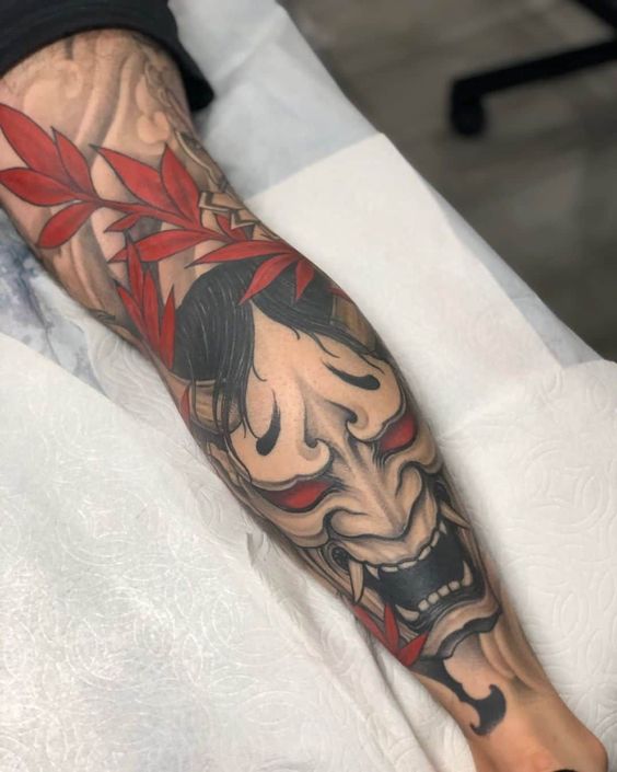 As for color choices, you have a wide range. Traditional black and gray are always classic, but adding color can make your tattoo stand out. Reds, blues, and purples are popular choices, adding an extra layer of depth to your Oni mask Japanese tattoo. Additionally, a splash of gold or silver can make the design truly unique.