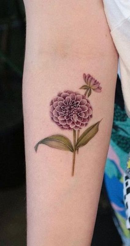 Additionally, the fourth design is a realistic small dahlia. It brings the flower’s intricate details to life. The fifth tattoo pairs the dahlia with other botanical elements. It represents nature’s interconnectedness and diversity. Moreover, the sixth tattoo is a dahlia in an abstract style. It offers a contemporary and unique perspective.