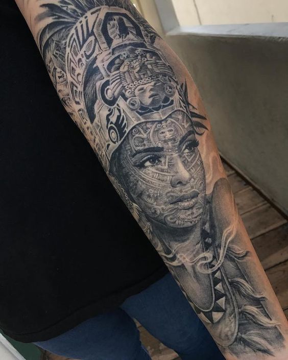 Moreover, Aztec warriors, known for their bravery and skill, are a common theme in intricate tattoos. These designs showcase their iconic armor and weapons. Similarly, the Aztec calendar, complex and detailed, makes for an awe-inspiring tattoo. It represents the passage of time and cosmic events.