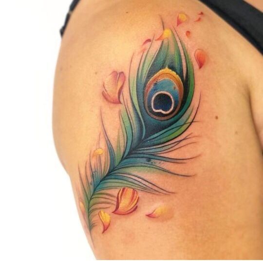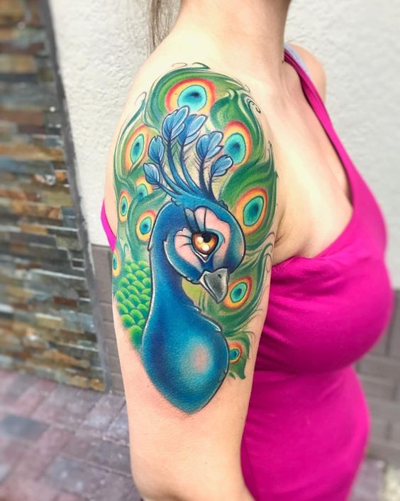Firstly, let’s talk about the design. Shoulder Peacock Tattoos are intricate and colorful. They often feature a mix of blues, greens, and purples. Moreover, the feathers can be designed to flow naturally along the shoulder’s curve. This makes the tattoo not just beautiful, but also anatomically harmonious.