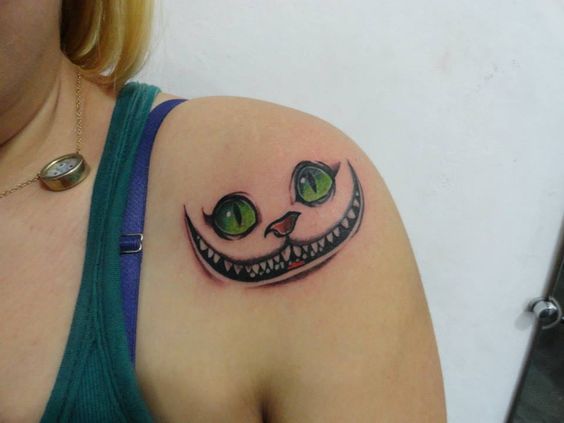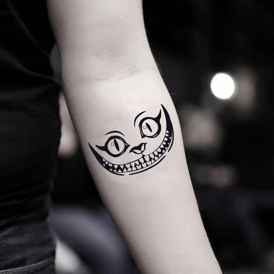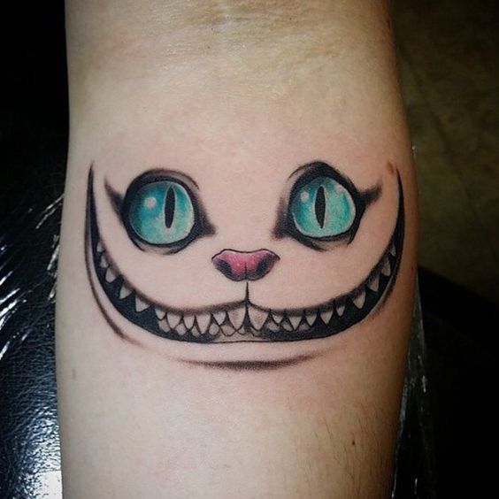 Moreover, the tattoo’s adaptability makes it suitable for various body parts. Whether it’s on the wrist, shoulder, or back, it makes a statement. The Cheshire Cat’s image can be intertwined with other elements too, like clocks or quotes, adding layers of meaning.