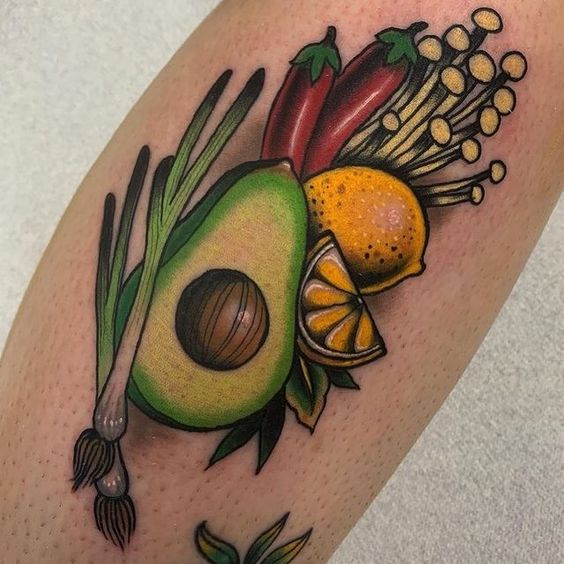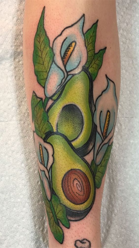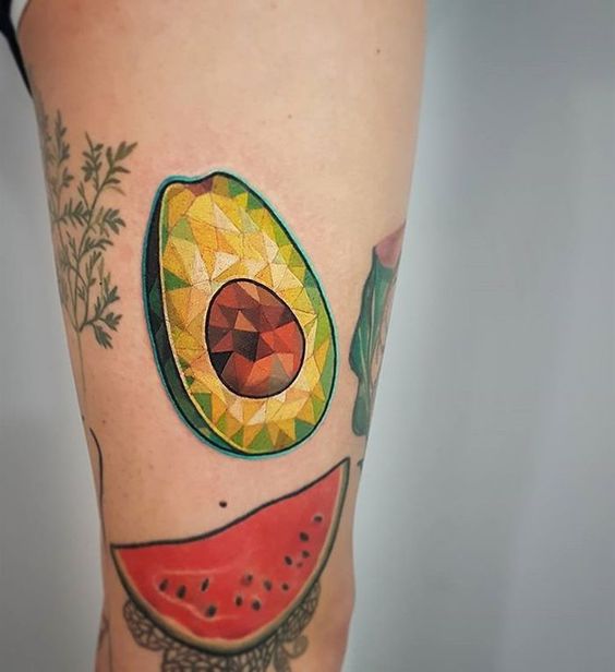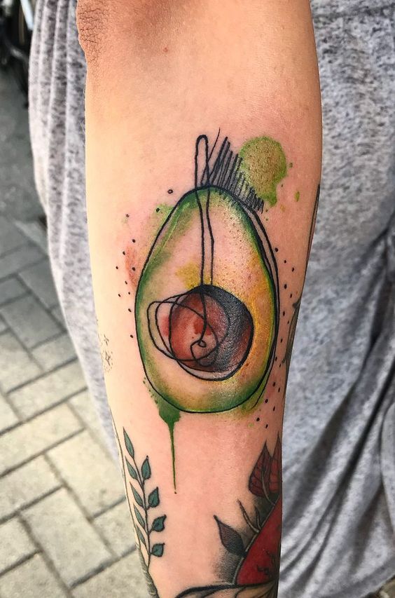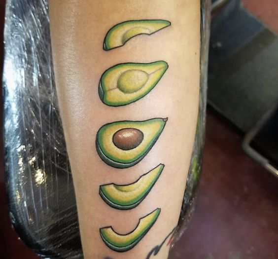 There’s an abstract avocado design too, merging different art styles. It’s a modern take that appeals to contemporary tastes. Another tattoo displays an avocado slice, its vivid colors and shading exceptional.